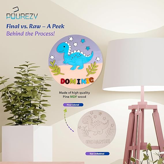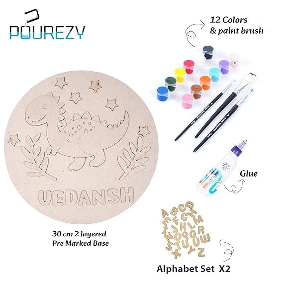Unleash your creativity with this comprehensive DIY Paint Kit from Pourezy! The set features a beautifully pre-marked 30 cm circular base with an elegant Dino design, perfect for creating personalized name plates or decorative pieces. The kit comes complete with 12 vibrant colours, professional paint brushes for precise application, and adhesive for assembly. What makes this kit special is the inclusion of two complete alphabet sets, allowing you to craft custom names or messages within your artwork. The two-layered base provides depth to your creation, while the pre-marked design ensures consistent, professional-looking results every time. Whether you're a beginner or experienced in crafts, this kit provides everything needed to create stunning personalized decor. The thoughtfully designed Dino pattern, featuring detailed Dino and leaves, adds a touch of natural beauty to your finished piece. Ideal for home decoration, gifting, or as an engaging creative activity for adults and children alike.