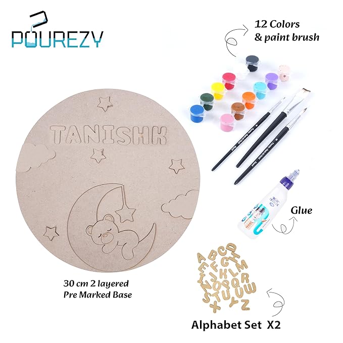 DIY Kit includes 12 acrylic paints, round & flat brushes, a 30cm MDF base & 3D elements, Fevicol, 2 Alphabet Set |