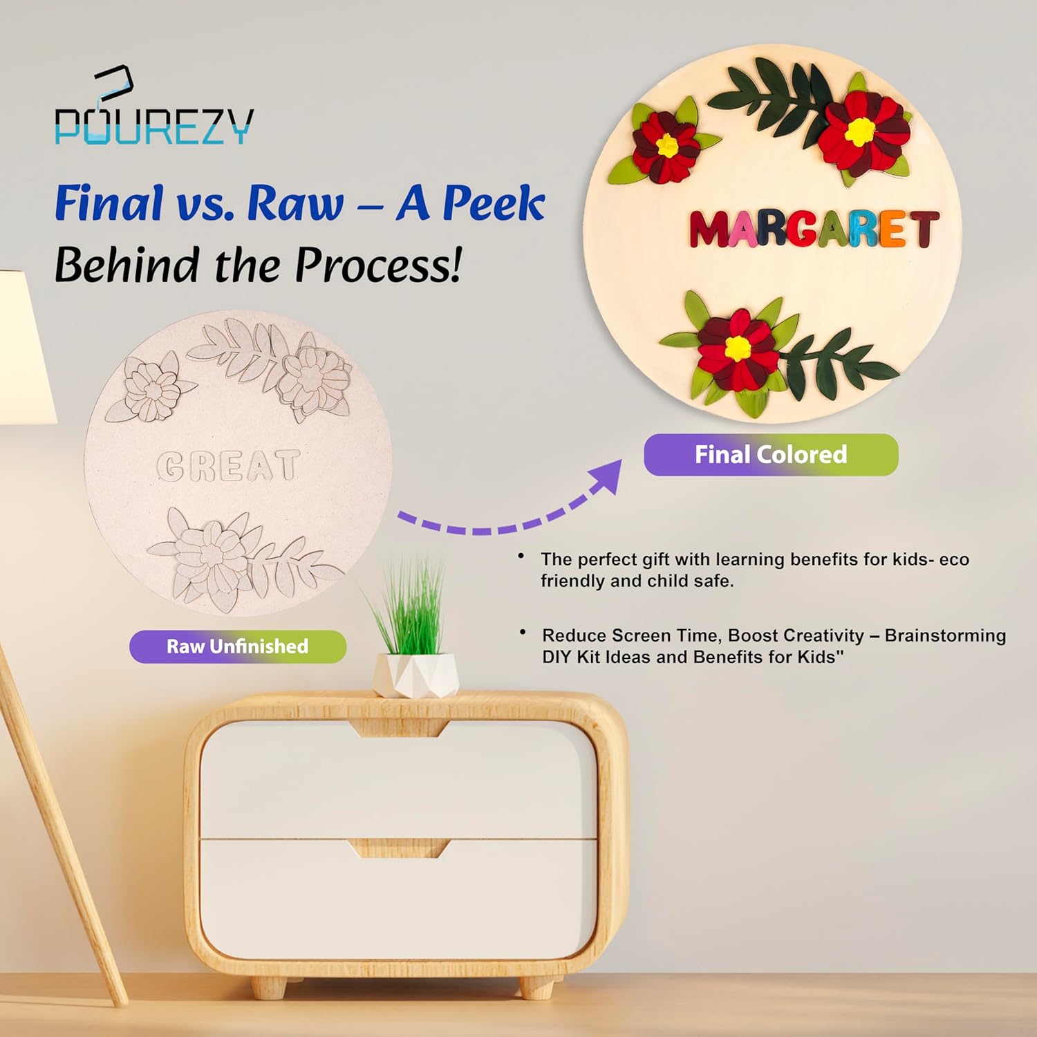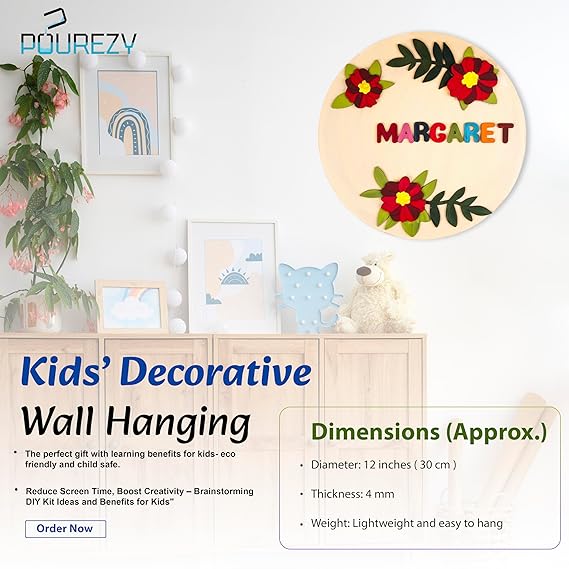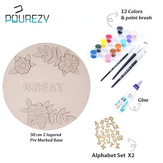- Complete DIY kit – Includes a 30 cm pre-marked circular base with floral design, 12 vibrant acrylic paints, brushes, glue, and two sets of alphabet letters.