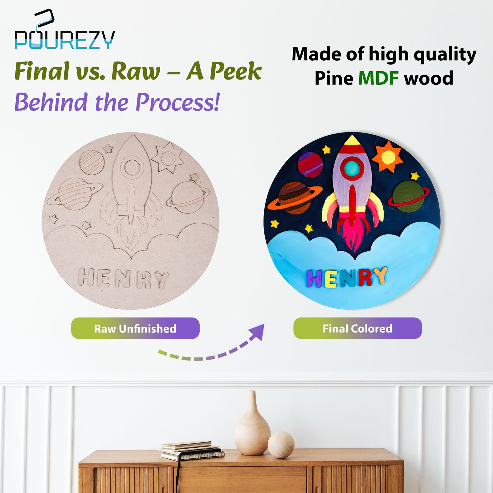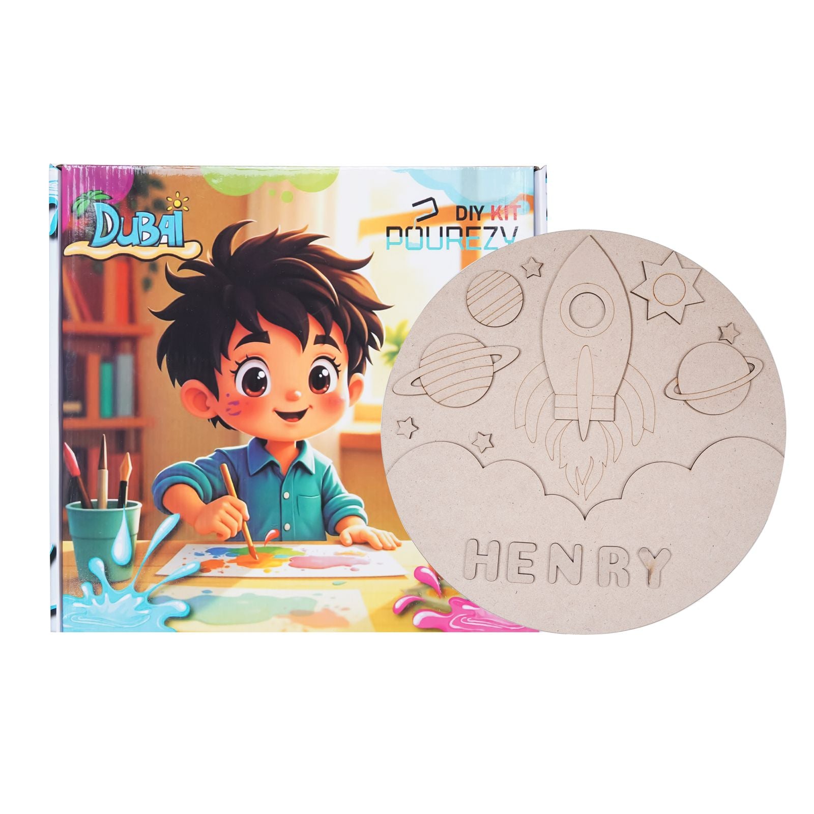 - COMPLETE KIT: Includes a 30 cm pre-marked space-themed base, 12 vibrant colours, paint brushes, glue and two sets of alphabet letters for personalisation