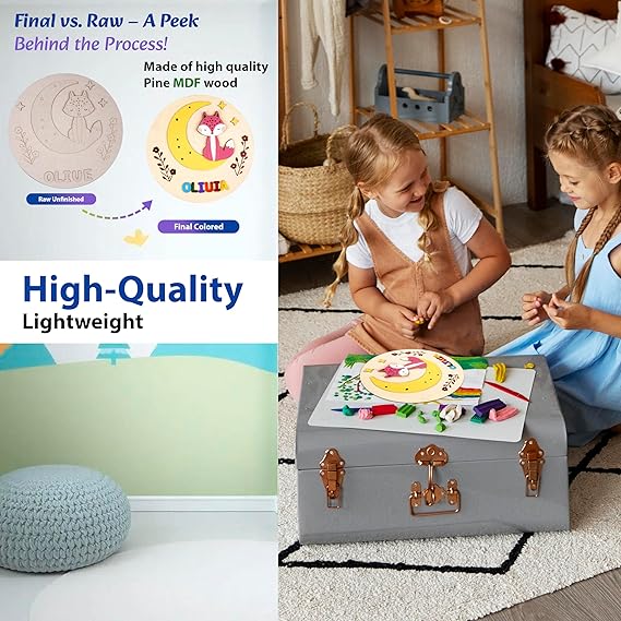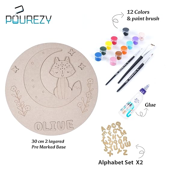 - COMPLETE KIT: Includes 30 cm pre-marked wooden base, 12 vibrant paint colours, paint brushes, glue, and 2 sets of alphabet letters for personalisation